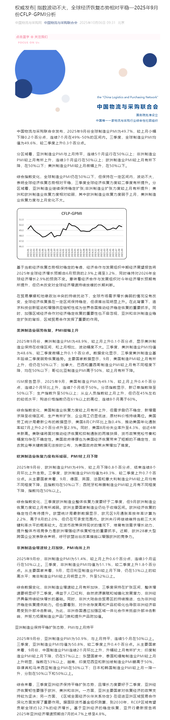 CCTV新闻:中国物流和采购联合会宣布了9月(10月6日)的全球制造采购经理指数。 2025年9月,PMI的全球制造业为49.7%,比上个月的0.2%略有下降,连续七个月内的范围为49%-50%。在第三季度,PMI的平均全球制造业为49.6%,比第二季度高达0.3%。到该地区,亚洲制造业PMI上个月是相同的,连续五个月运行超过50%;自上个月以来,非洲制造业PMI已经上升,并且连续三个月的运行率超过50%。自上个月以来,欧洲欧洲制造业PMI已下降,低于50%;自上个月以来,美国制造业PMI略有升高,低于50%。根据综合指数的变化,PMI的全球制造业仍然低于50%,但它仍然在一定范围内,并且有一些变化,这表明全球经济复苏相对稳定,并且与第二季度相比,第三季度经济经济的全球复苏增加了。通过该地区,亚洲制造业将继续保持稳定的扩张。与上个月相比,非洲制造业的扩大增加了;美国和欧洲的制造业的恢复相对脆弱,其中欧洲制造业的回收率比上个月弱,并且自上个月以来,美国制造业的恢复就发生了变化。根据当前的经济复苏趋势,对经济和发展经济和发展的中期经济观点将2025年对经济增长的全球预测从6月的2.9%提高到3.2%,同时维持2.9%的全球Econo预测麦克风在2026年不断变化的经济增长。这意味着,今年的经济合作与发展发展组织的经济增长组织有所增加,但并没有改变继续减慢全球经济增长的长期判断。在贸易摩擦和地缘政治冲突的持续破坏下,市场中全球需求的脆弱增长没有改变。尽管全球经济复苏仍然坚定不移,但很难看到IA的大幅增长。在这种背景下,追求驱动和增强供应链的技术变革已成为全球促进稳定经济复苏的重要工具。同时,不容忽视加强经济合作与稳定的经济复苏的重要性。在亚洲和非洲的制造业稳定扩张的背后,该地区的贸易合作起着重要作用。(收费编辑:MA Changyan)