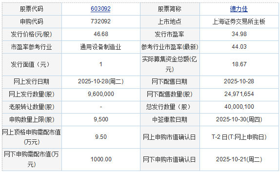 德力嘉传动科技(江苏)股份有限公司 保荐机构(主承销商):华泰联合证券股份有限公司 发行情况: 公司简介:公司主要从事高速重载精密齿轮传动产品的研发、制造和销售。下游应用领域目前主要为风力发电机组,主要产品为风电主齿轮箱。南京晨瑞直接持有公司30.53%的股份,为公司控股股东。南京晨瑞直接持有公司30.53%的股份。孔金峰直接持有该公司7.63%的股份,并与刘建国共同持有南京晨瑞投资100%的股份。同时,孔金峰担任无锡德通执行合伙人,持有无锡德通21.40%股权投资,从而间接控制公司3.82%的股份。刘建国和孔金峰是情侣。合计直接、间接持有公司38.98%的股份,共同控制公司41.98%的股份。他们是公司的实际控制人。德力嘉2025年10月17日披露的首次公开发行股票并在主板上市招股书显示,公司拟募集资金18.808亿元,用于年生产1000台8MW以上大型陆上风电齿轮箱,汕头市德力嘉传动有限公司。得力嘉于2025年10月27日公告的首次公开发行股票并在主板上市显示,按发行价格46.68元/股、新股发行数量40,000,100股计算,若本次发行成功,公司预计共募集资金186,720.4668元。扣除发行费用后万元9294.72万元(含印花税,不含增值税),预计募集资金净额为177,425.74万元(最终数字如有差异,系四舍五入所致)。中城致信工程咨询集团股份有限公司(北京证券交易所)保荐机构(主承销商):东吴证券公司,项目工程经验丰富,公司致力于为客户提供工程造价、代理招投标、工程监理、BIM服务等专业技术服务,并在工程方面,以及良好的、。全流程咨询服务。公司成立于2002年1月,2016年12月在新三板挂牌挂牌公开转让,2023年5月转入转型层面。公司控股股东为徐学雷,实际控制人为陆军、徐学雷。截至招股书签署之日,徐学雷直接持有 29,10持有公司股份9,222股,直接持股比例为57.40%,并通过程来恒、程兴恒担任执行合伙人控制公司股份15,000,000股,间接持股比例为29.58%。徐学雷合计控制公司股份44,109,222股。该股份合计控制公司86.98%的投票权。即使陆军并不持有公司股份,但他担任公司董事长和总经理,在公司经营决策中发挥着重要作用。因此,陆军、徐学雷为公司实际控制人。众诚咨询2025年10月14日发布的招股书(注册稿)显示,公司拟募集资金19989.52万元,用于服务建设网络建设项目、研发及信息化建设项目。关于向不特定合格投资者公开发行股票并在北交所上市的公告华诚咨询2025年10月24日披露的京交所显示,若本次发行成功,公司预计募资总额19978万元。扣除发行费用2661.6万元(不含增值税)后,预计募集资金净额为17316.4万元。